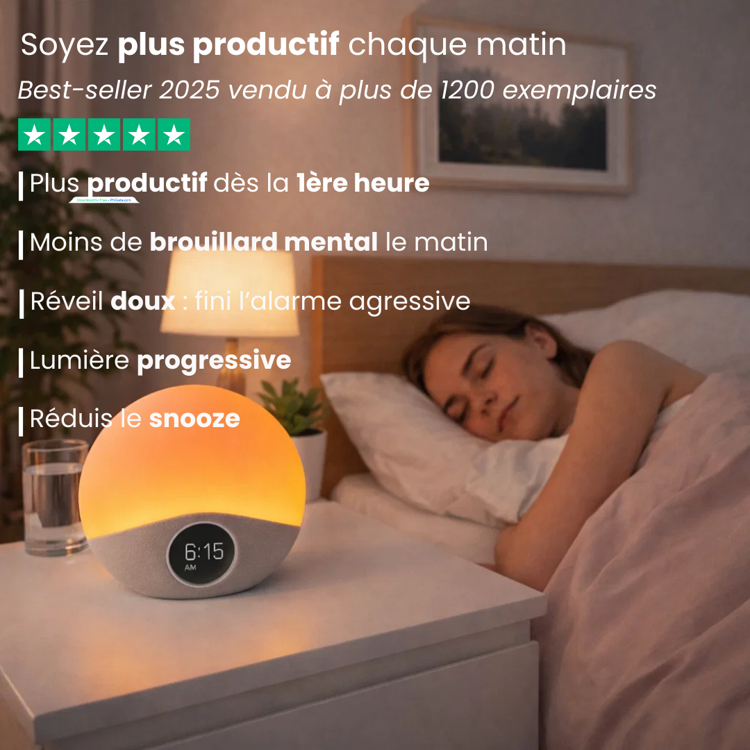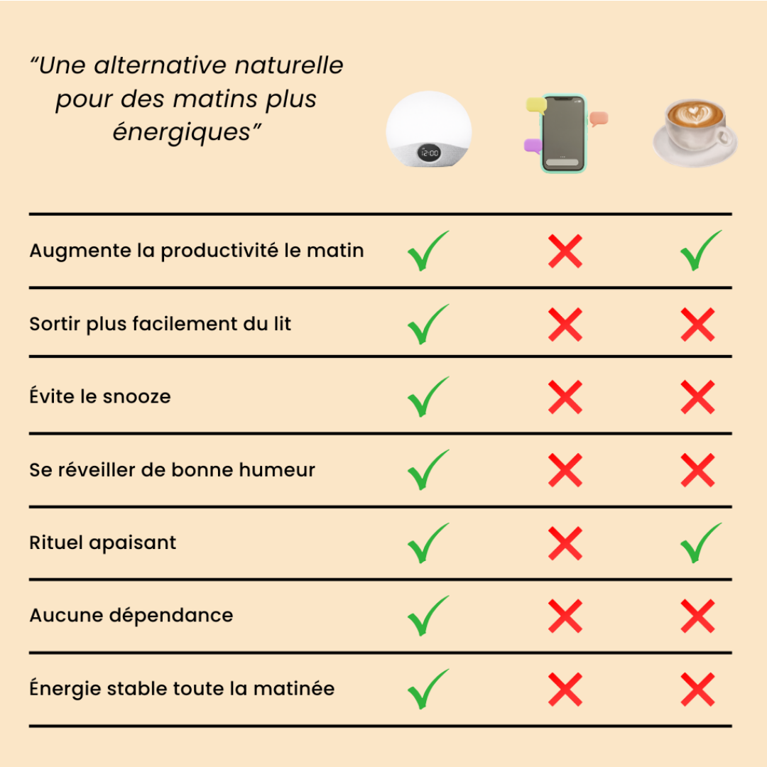 La montée de lumière me réveille naturellement, c'est hyper agréable. Fini les alarmes stressantes.